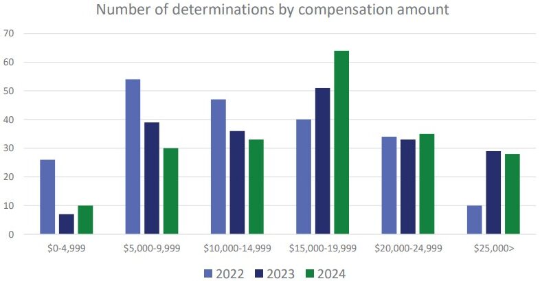 There has been a continued rise in the compensation awarded to successful litigants under section 123(1)(c)(i) of the Act. This type of compensation is for humiliation, loss of dignity, and injury to the feelings suffered by an employee and is tax free. The Report shows that the majority of the awards in 2024 were between $15,000 and $19,999, followed by awards between $20,000 and $24,999.